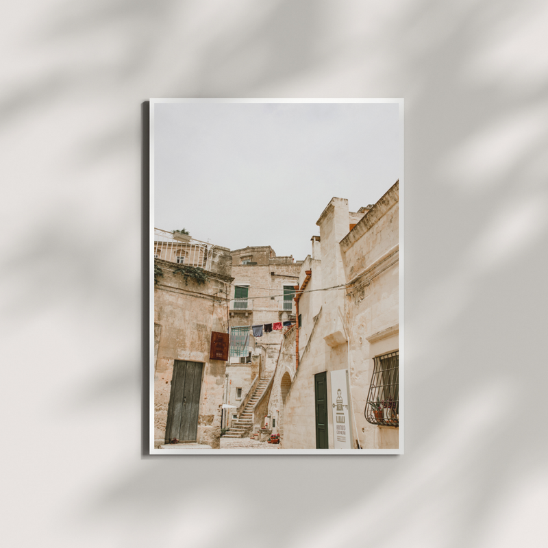 Back streets tangled like old yarn. Washing flaps in the wind above sun-washed stone.Printed on natural rag, this one feels like linen drying in Mediterranean heat. This item is print only, ready to be framed by you.